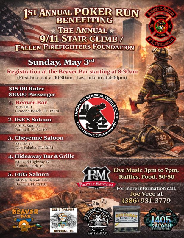 Come ride in our 1st Annual Poker Run Benefiting the 911 Annual Stair Climb/Fallen Firefighter Foundation.